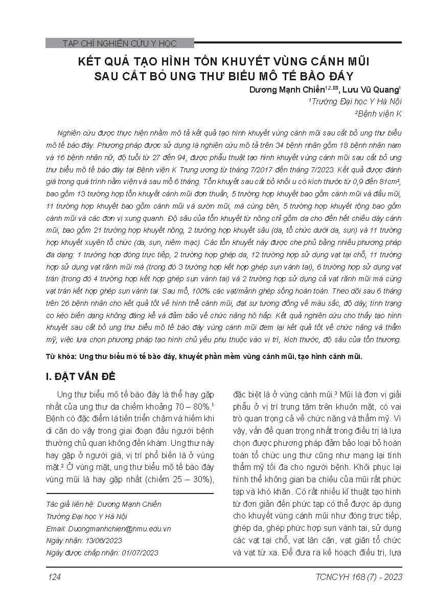 Kết quả tạo hình tổn khuyết vùng cánh mũi sau cắt bỏ ung thư biểu mô tế bào đáy = Outcome of reconstruction after resection basal cell carcinoma in the nasal alar area