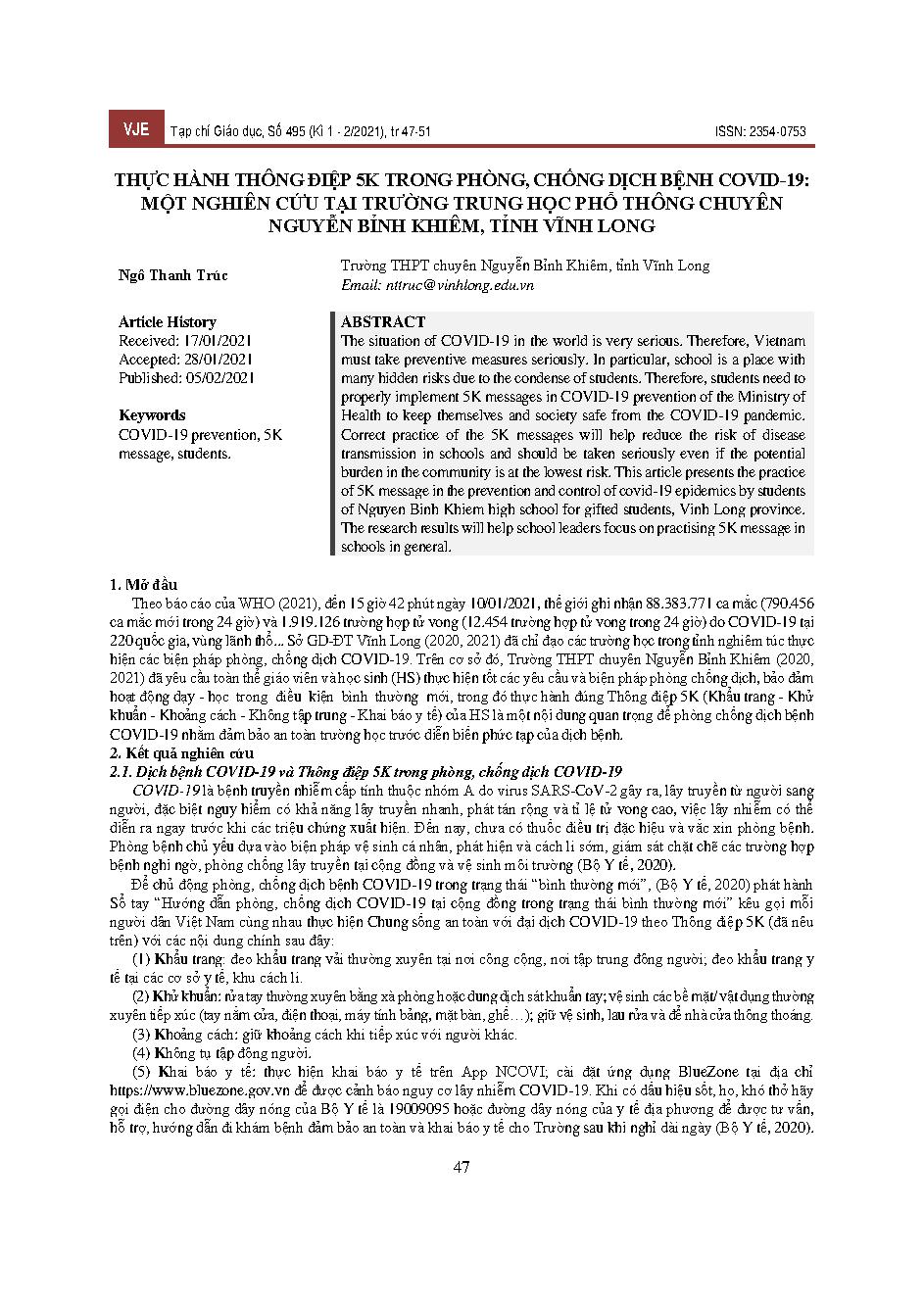Thực hành thông điệp 5k trong phòng, chống dịch bệnh Covid-19: Một nghiên cứu tại Trường Trung học phổ thông Chuyên Nguyễn Bỉnh Khiêm, tỉnh Vĩnh Long