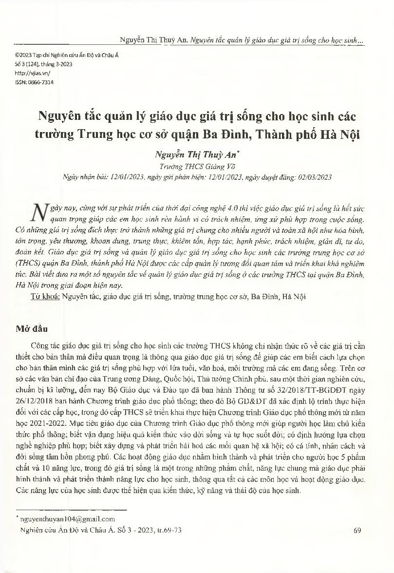 Nguyên tắc quản lý giáo dục giá trị sống cho học sinh các trường Trung học cơ sở quận Ba Đình, Thành phố Hà Nội