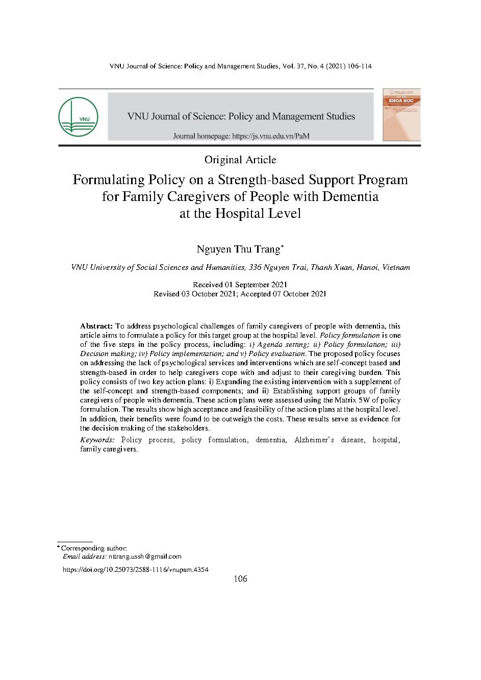Đề xuất phát triển chính sách hỗ trợ dựa vào điểm mạnh cho người nhà chăm sóc bệnh nhân sa sút trí tuệ ở quy mô bệnh viện = Formulating policy on a strength-based support program for family caregivers of people with dementia at the hospital level