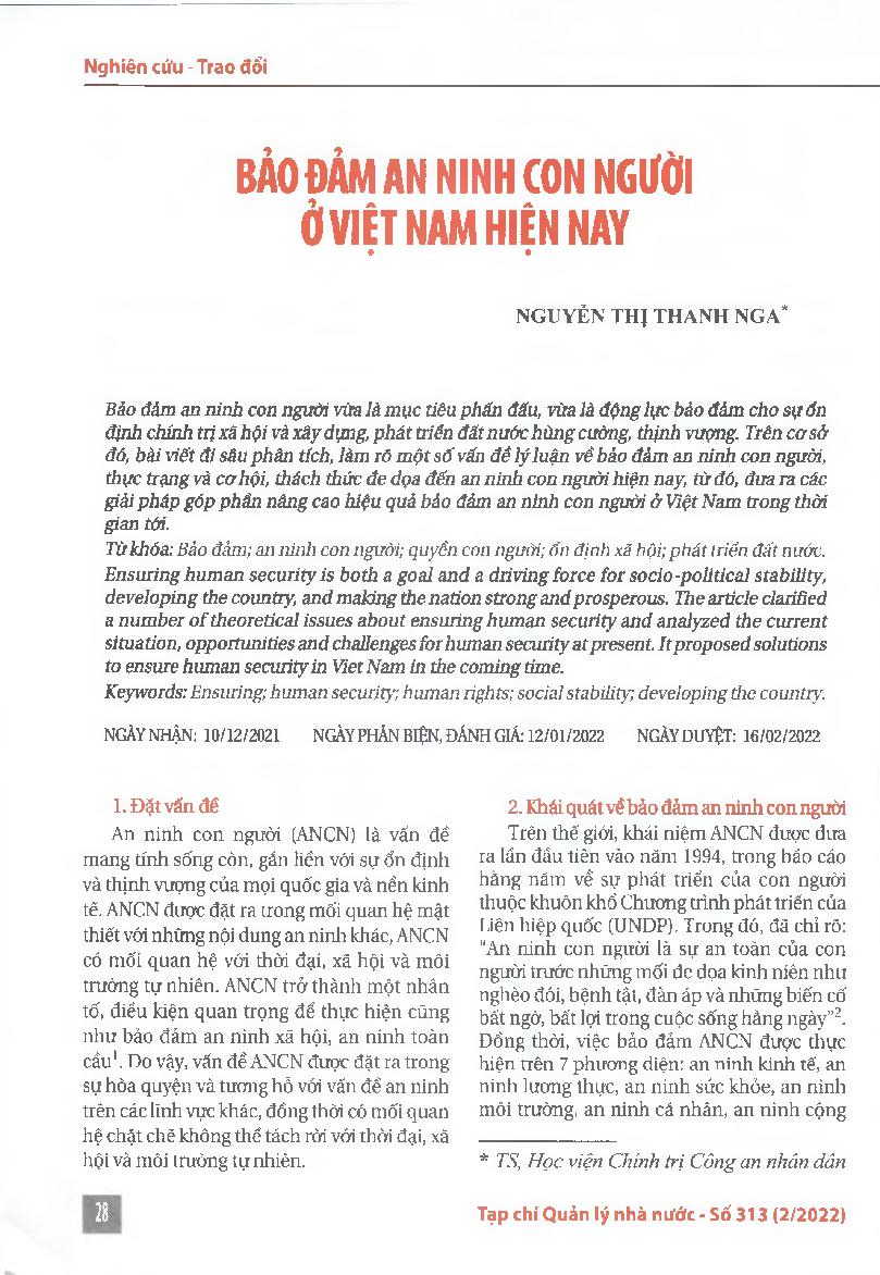 Bảo đảm an ninh con người ở Việt Nam hiện nay = Ensuring human security in Viet Nam at present