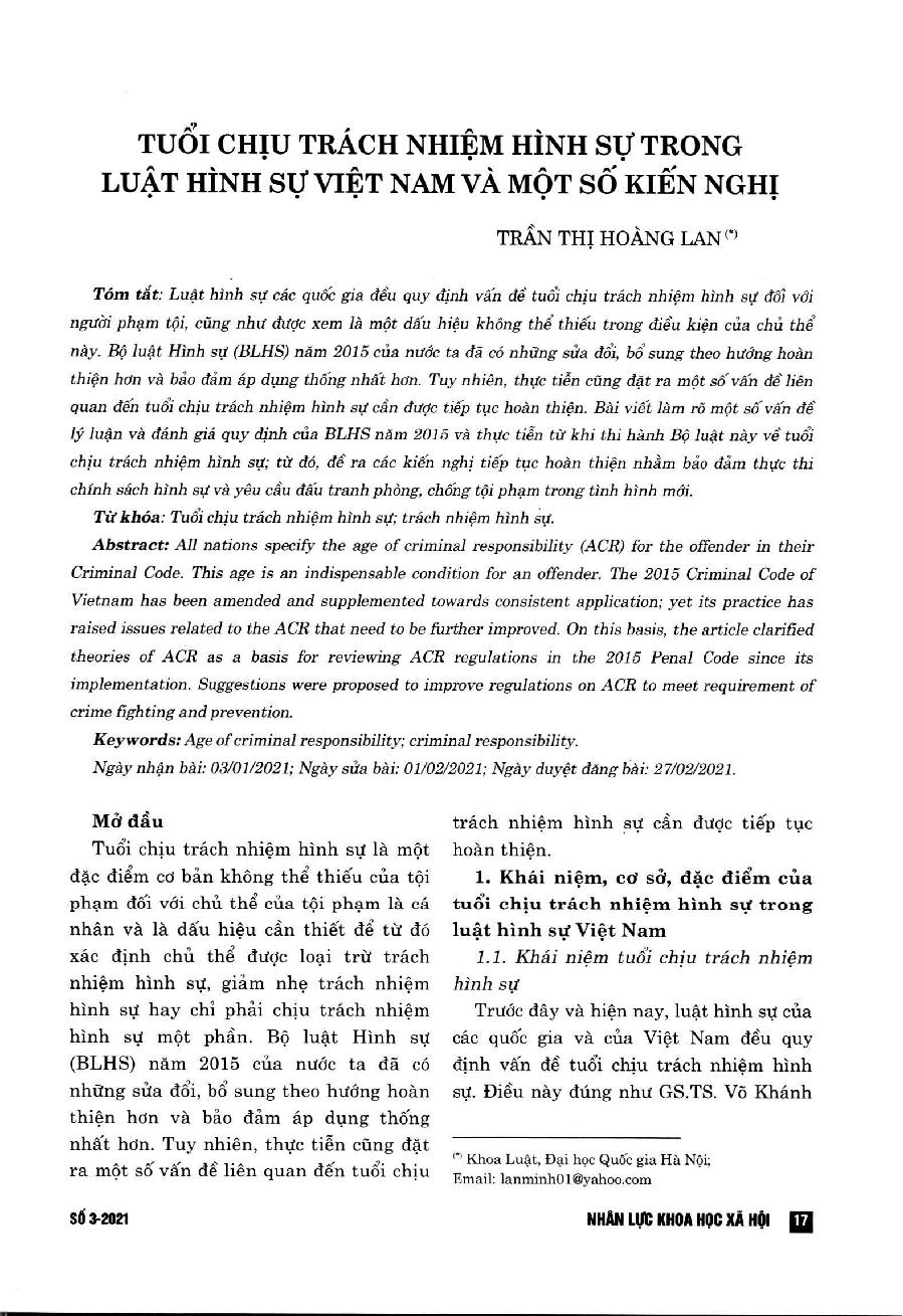 Tuổi chịu trách nhiệm hình sự trong luật hình sự Việt Nam và một số khuyến nghị = Age of criminal responsibility in Vietnamese Criminal Code and some suggestions