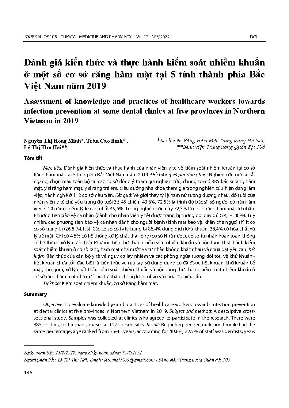 Đánh giá kiến thức và thực hành kiểm soát nhiễm khuẩn ở một số cơ sở răng hàm mặt tại 5 tỉnh thành phía Bắc Việt Nam năm 2019 = Assessment of knowledge and practices of healthcare workers towards infection prevention at some dental clinics at five provinc