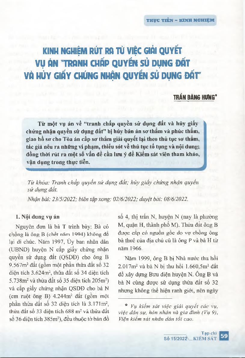 Kinh nghiệm rút ra từ việc giải quyết vụ án “tranh chấp quyền sử dụng đất và hủy giấy chứng nhận quyền sử dụng đất”