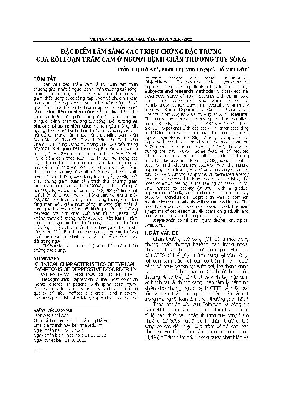 Đặc điểm lâm sàng các triệu chứng đặc trưng của rối loạn trầm cảm ở người bệnh chấn thương tuỷ sống = Clinical characteristics of typical symptoms of depressive disorder in patients with spinal cord injury