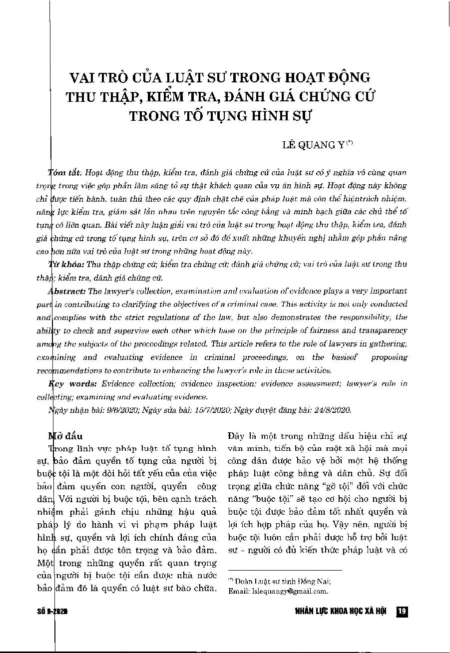 Vai trò của luật sư trong hoạt động thu thập, kiểm tra, đánh giá chứng cứ trong tố tụng hình sự = The role of lawyer in evidence collection, inspection and assessment in criminal procedure