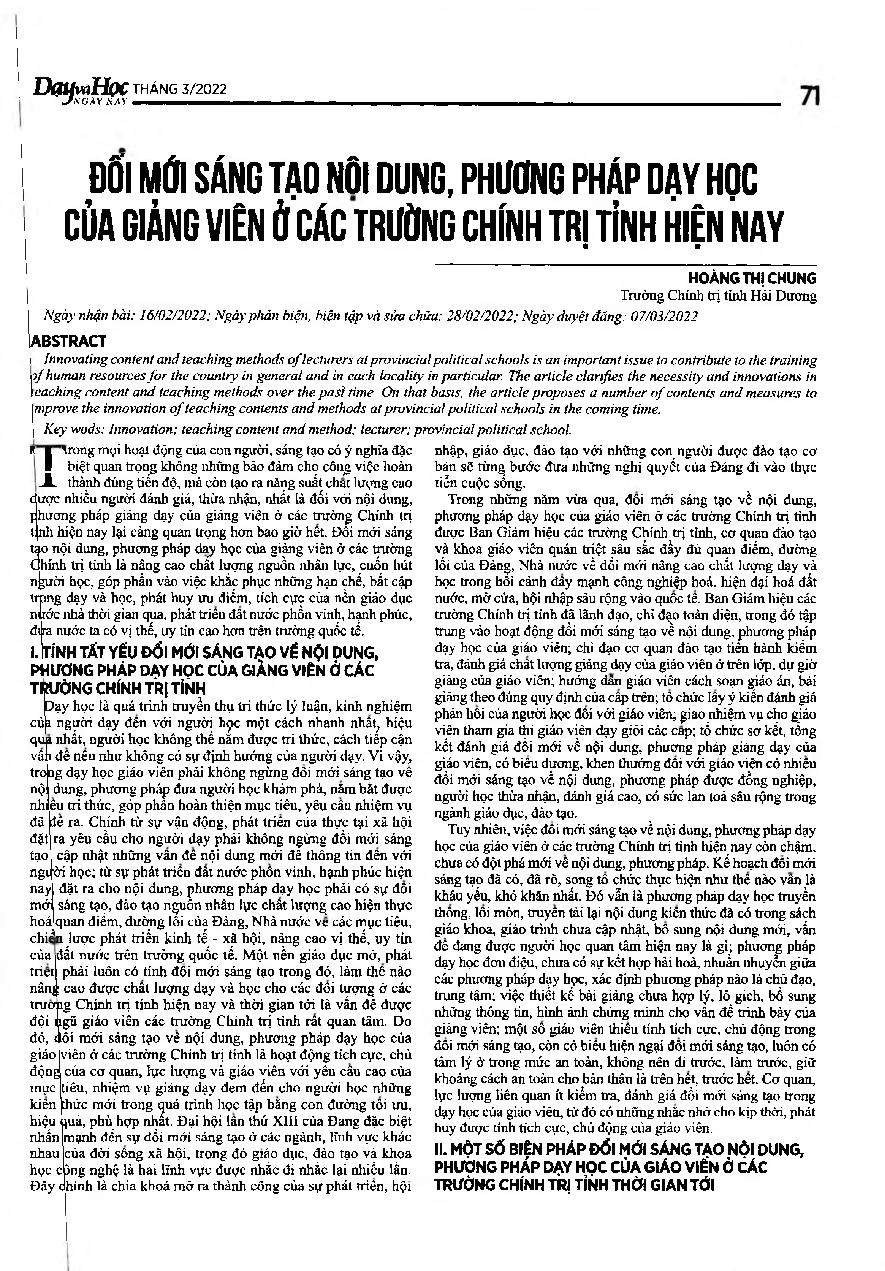 Đổi mới sáng tạo nội dung, phương pháp dạy học cùa giảng viên ở các trường chính trị tỉnh hiện nay = Innovating content and teaching methods of lecturers at provincial political schools today