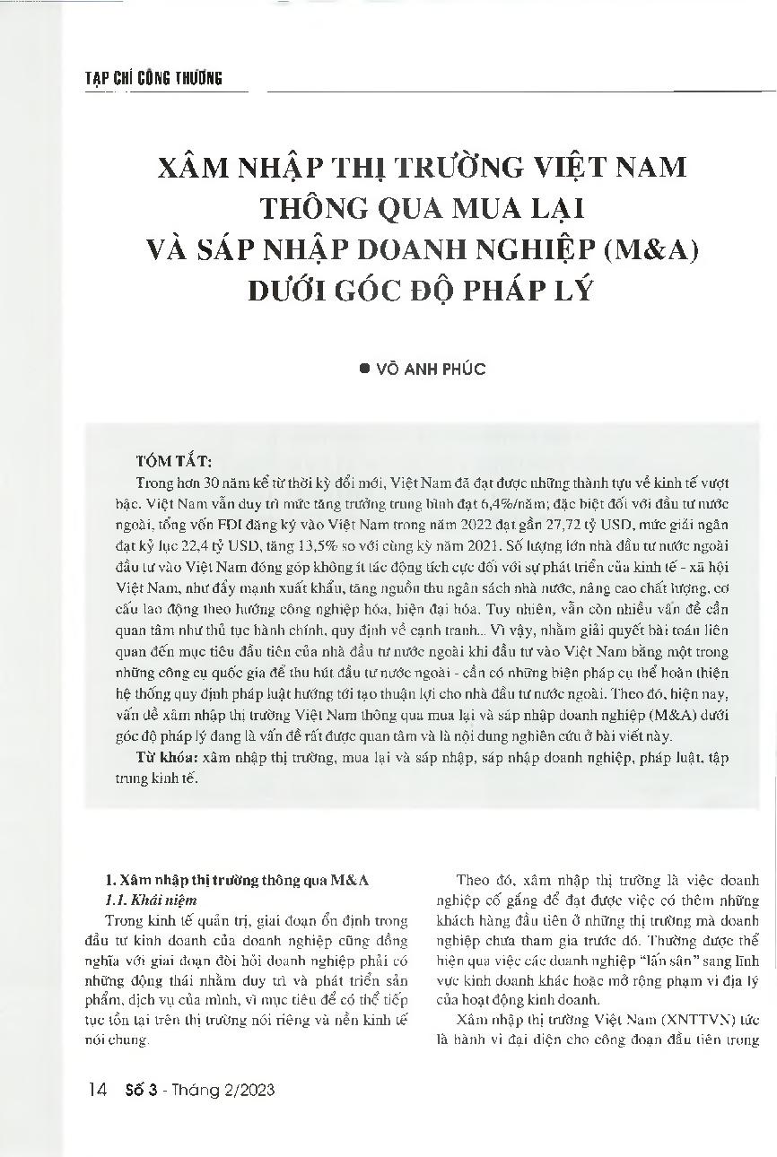 Xâm nhập thị trường Việt Nam thông qua mua lại và sáp nhập doanh nghiệp (M &A) dưới góc độ pháp lý = Entering the Vietnamese market through mergers & acquisitions (M &A) from the perspective of current laws
