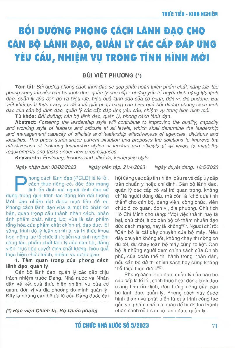 Bồi dưỡng phong cách lãnh đạo cho cán bộ lãnh đạo, quản lý các cấp đáp ứng yêu cầu, nhiệm vụ trong tình hình mới = Fostering the leadership style for leaders and officials at all levels to meet the requirements and tasks under new circumstances
