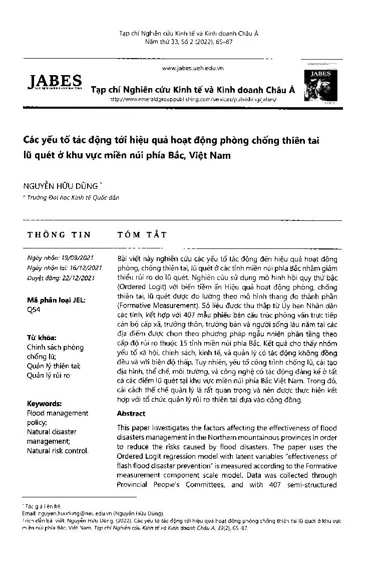Các yếu tố tác động tới hiệu quả hoạt động phòng chống thiên tai lũ quét ở khu vực miền núi phía Bắc, Việt Nam = Factors affecting the effectiveness of flash flood prevention activities in the northern mountainous areas of Vietnam