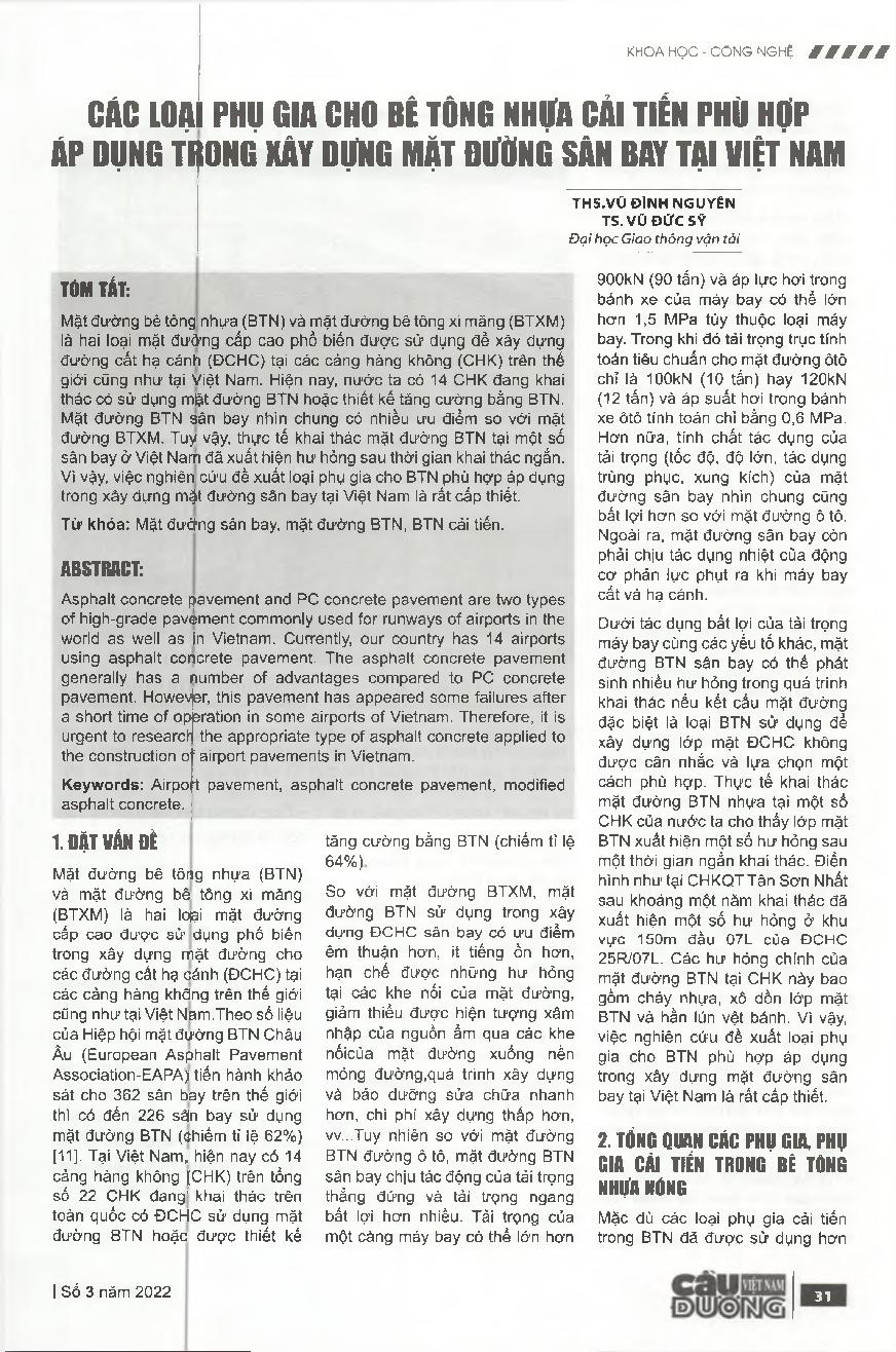 Các loại phụ gia cho bê tông nhựa cải tiến phù hợp áp dụng trong xây dựng mặt đường sân bay tại Việt Nam = Types of additions for modified asphalt concrete for the application to the construction of runway pavements in Vietnam