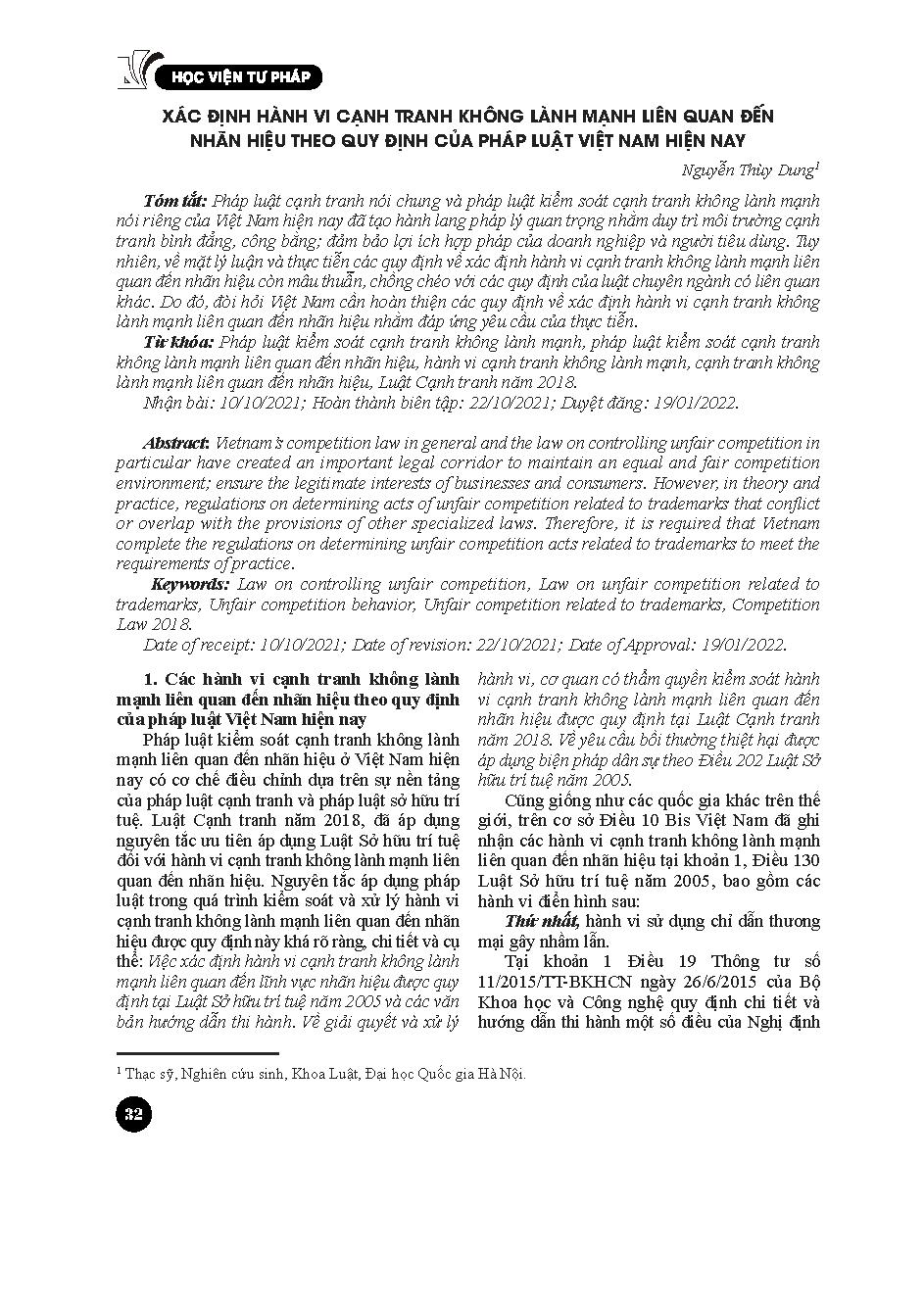 Xác định hành vi cạnh tranh không lành mạnh liên quan đến nhân hiệu theo quy đinh của pháp luật Việt Nam hiện nay = Determining unfair competitive acts related to trademark under existing legal regulations of Vietnam