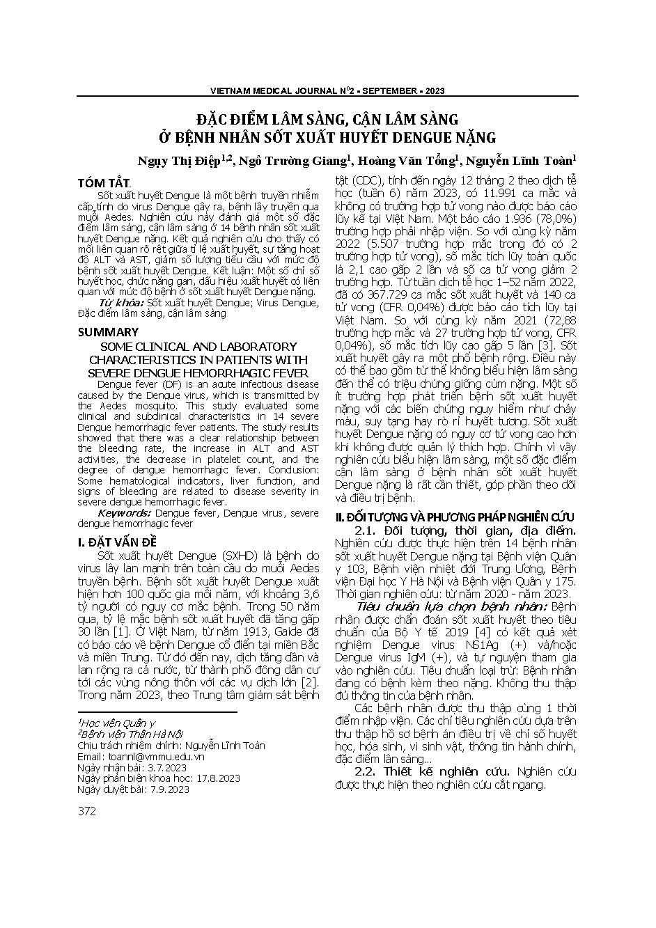 Đặc điểm lâm sàng, cận lâm sàng ở bệnh nhân sốt xuất huyết dengue nặng = Aome clinical and laboratory characteristics in patients with severe dengue hemorrhagic fever