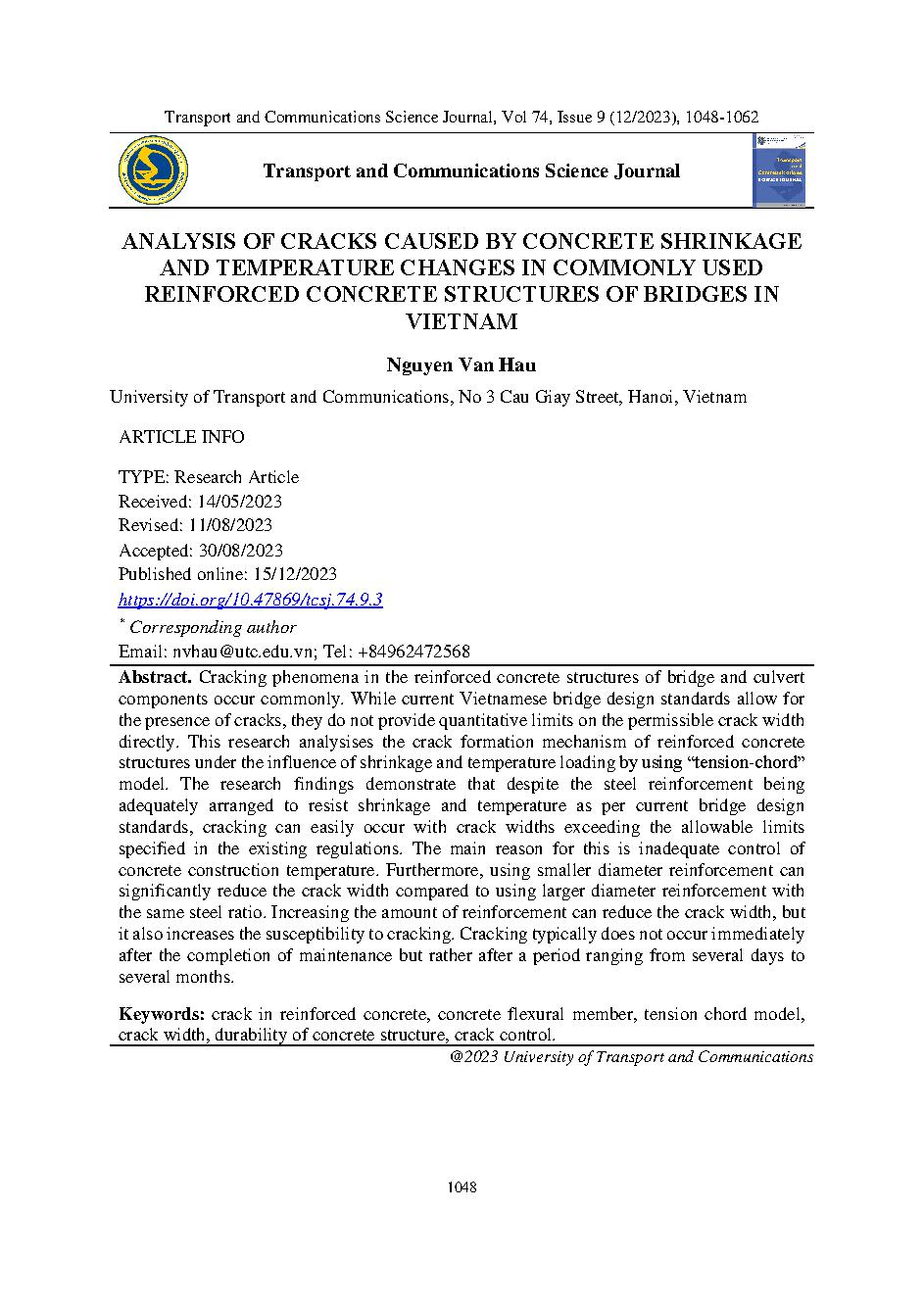 Phân tích vết nứt do co ngót bê tông và nhiệt độ thay đổi trong các kết cấu cầu bê tông cốt thép phổ biến tại Việt Nam = Analysis of cracks caused by concrete shrinkage and temperature changes in commonly used reinforced concrete structures of bridges in
