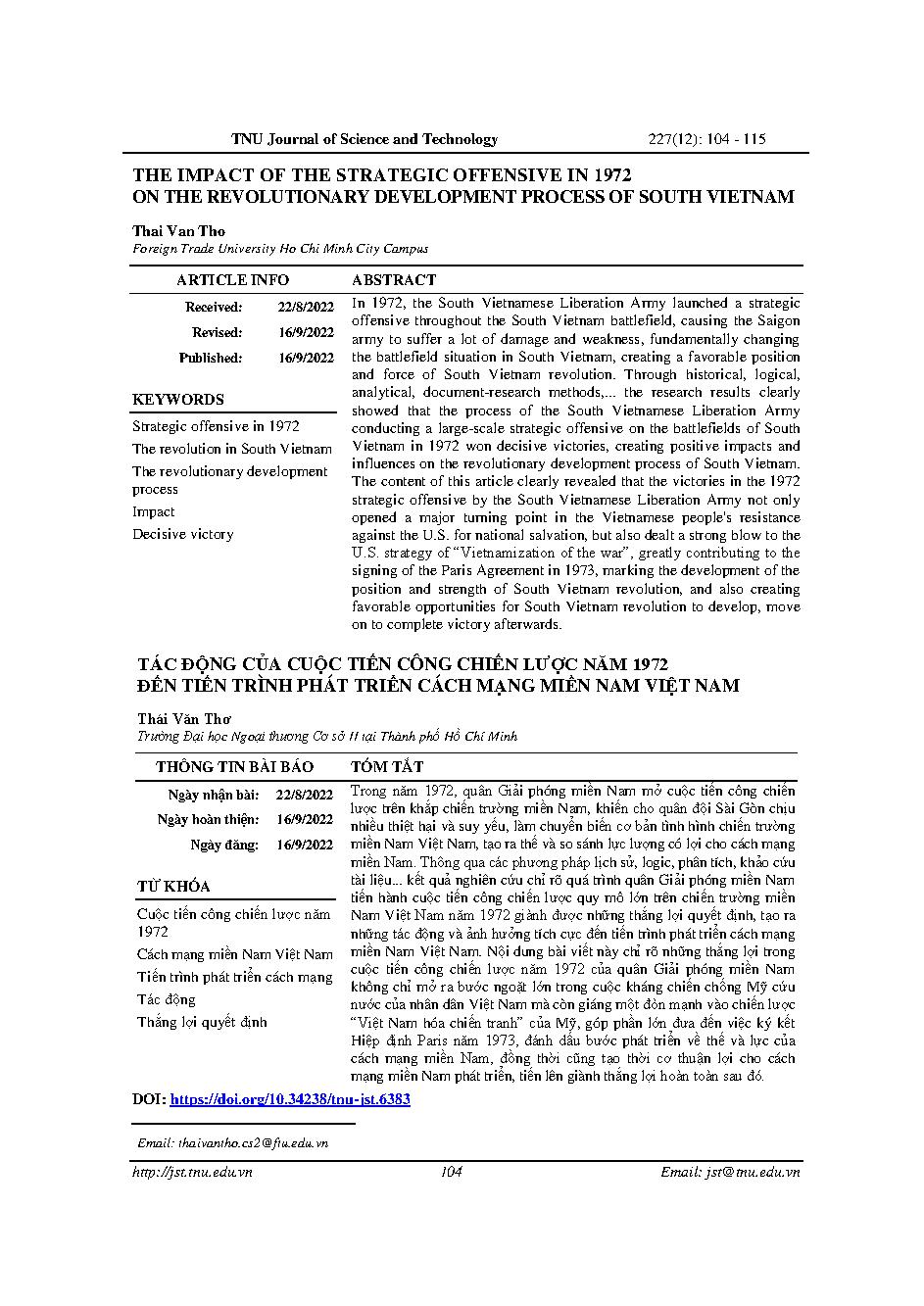 Tác động của cuộc tiến công chiến lược năm 1972 đến tiến trình phát triển cách mạng miền nam Việt Nam = The impact of the strategic offensive in 1972 on the revolutionary development process of south vietnam