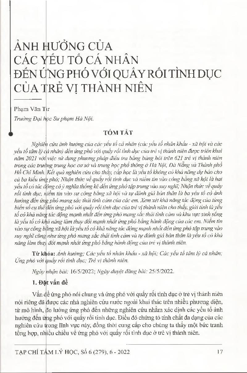 Ảnh hưởng của các yếu tố cá nhân đến ứng phó với quấy rối tình dục của trẻ vị thành niên = The influence ofindividualfactors on the response to sexual harassment ofadolescence
