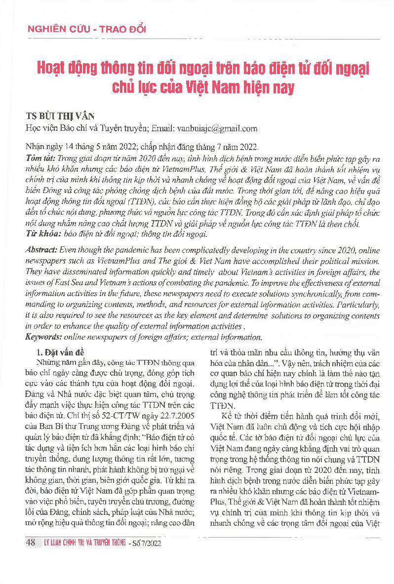 Hoạt động thống tin đối ngoại trên báo điện tử dối ngoại chủ lực của Việt Nam hiên nay = Activities of external information on Vietnam&; 39;s main foreign online newspapers today