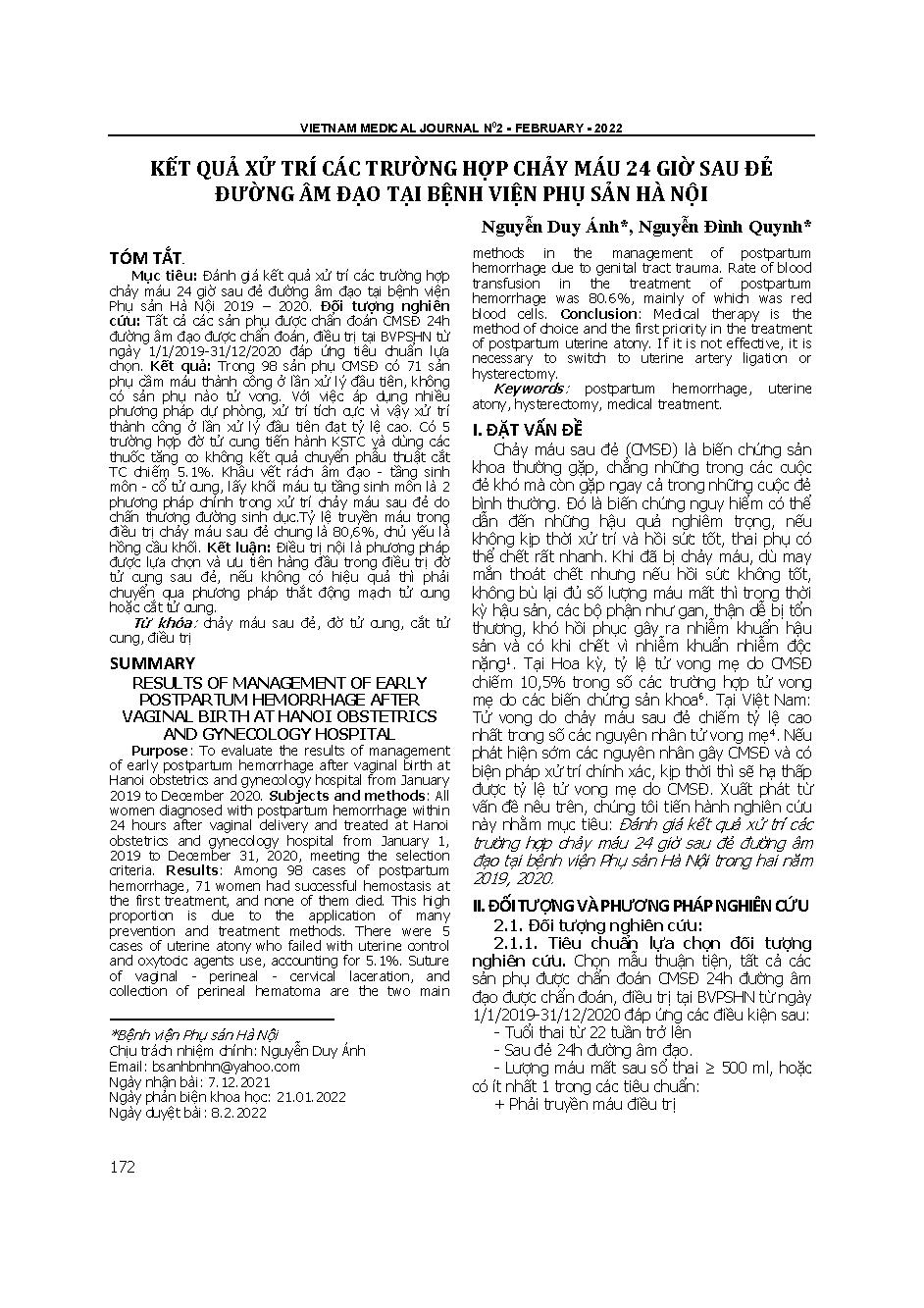 Kết quả xử trí các trường hợp chảy máu 24 giờ sau đẻ đường âm đạo tại Bệnh viện Phụ sản Hà Nội = Results of management of early postpartum hemorrhage after vaginal birth at Hanoi obstetrics and gynecology hospital