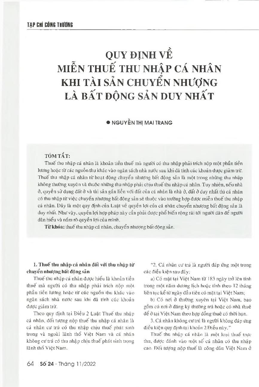 Quy định về miễn thuế thu nhập cá nhân khi tài sản chuyển nhượng là bất động sản duy nhất = Provisions on individual income tax exemption from the transfer of real estate if the transfered property is the only real estate owned by the transferor