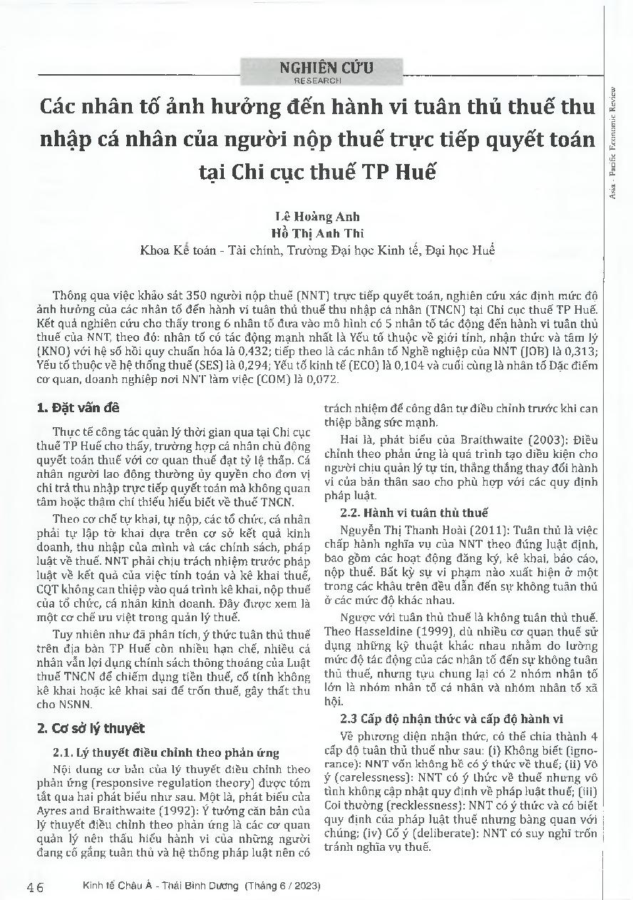 Các nhân tố ảnh hưởng đến hành vi tuân thủ thuế thu nhập cá nhân của người nộp thuế trực tiếp quyết toán tại Chi cục thuế TP Huế