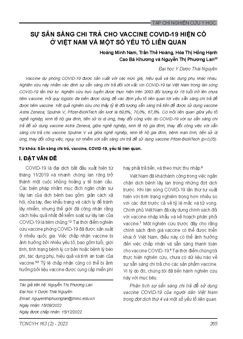 Sự sẵn sàng chi trả cho vaccine Covid-19 hiện có ở Việt Nam và một số yếu tố liên quan