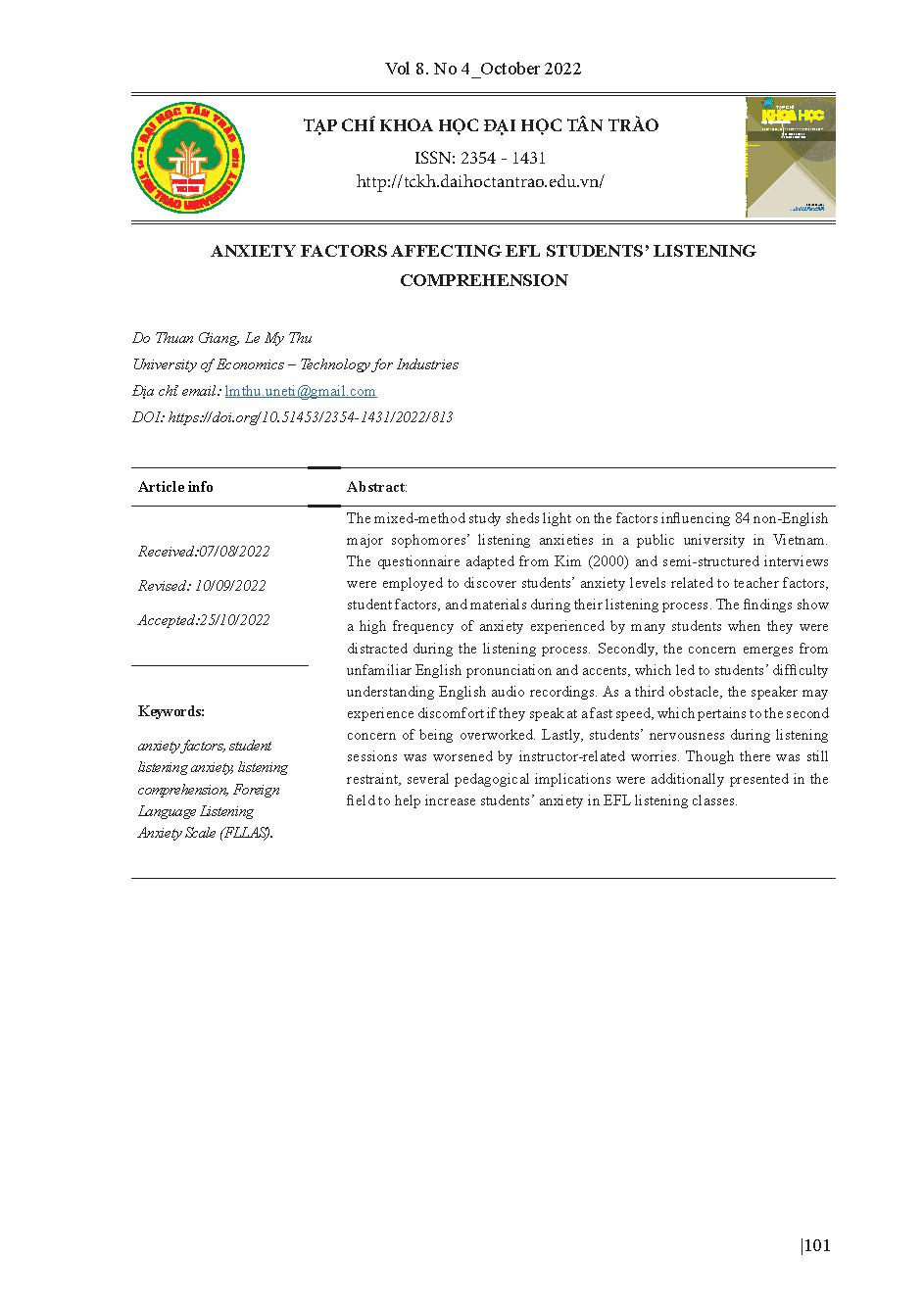 Các yếu tố lo lắng ảnh hưởng đến khả năng nghe hiểu của sinh viên không chuyên tiếng Anh = Anxiety factors affecting efl students’ listening comprehension