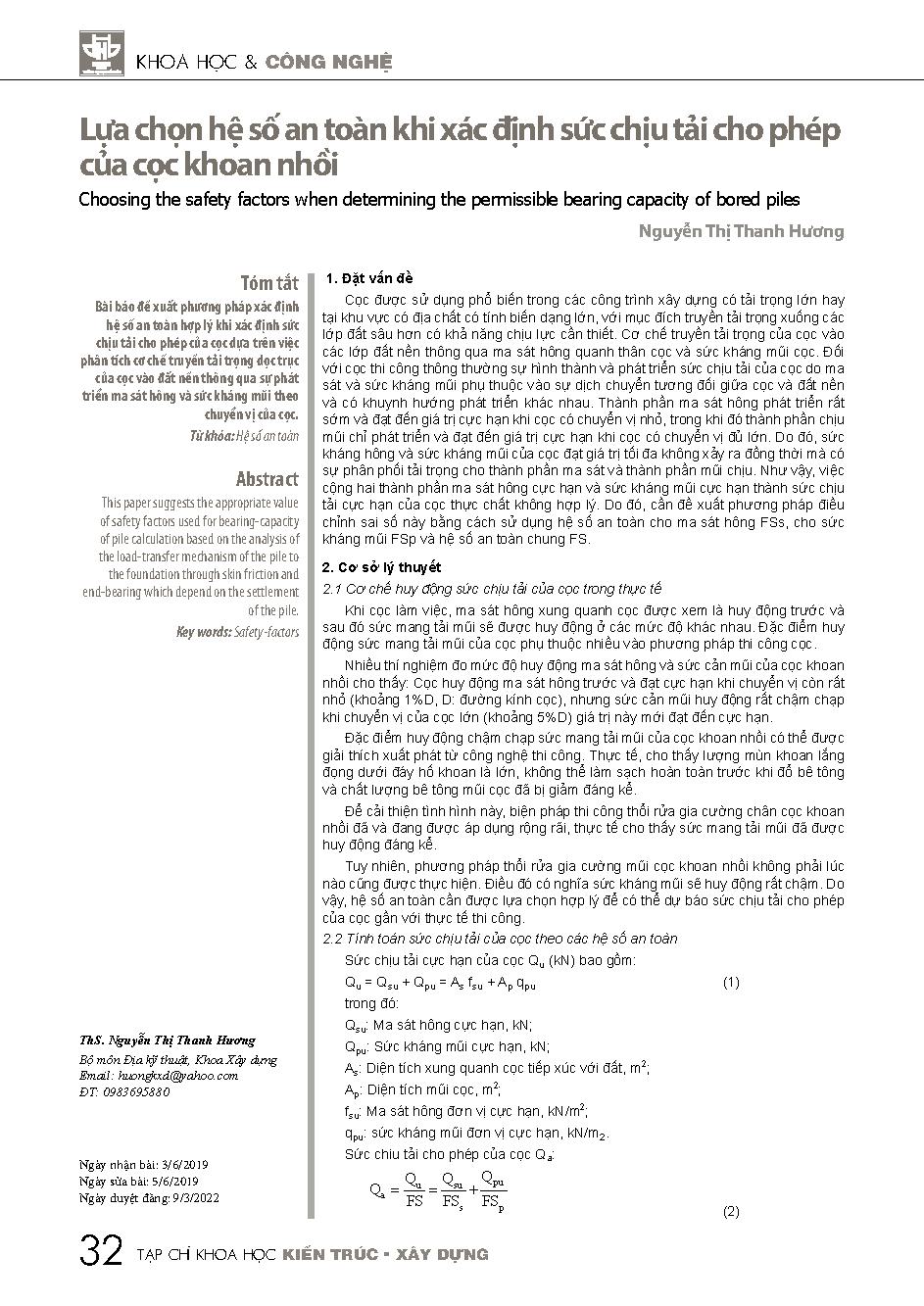 Lựa chọn hệ số an toàn khi xác định sức chịu tải cho phép của cọc khoan nhồi = Choosing the safety factors when determining the permissible bearing capacity of bored piles
