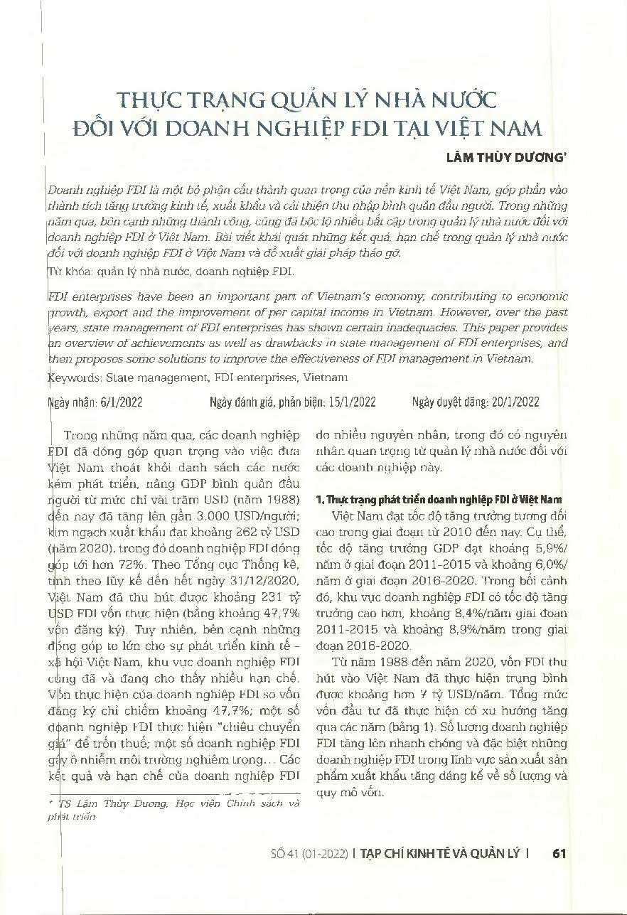 Thực trạng quản lý nhà nước đối với doanh nghiệp FDI tại Việt Nam = Current situation of state management of FDI enterprises in Vietnam