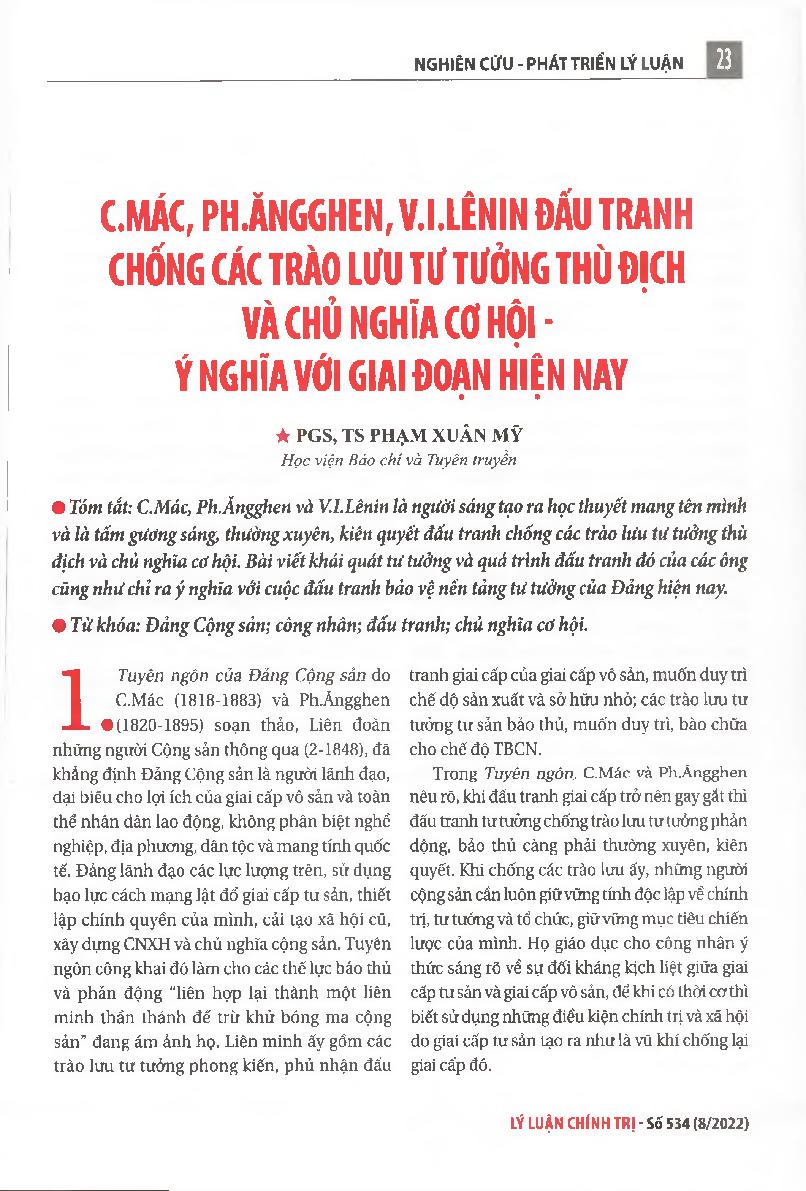 C.Mác, Ph.Ăngghen, V.I.Lênin đấu tranh chống các trào lưu tư tưởng thù địch và chủ nghĩa cơ hội - Ý nghĩa với giai đoạn hiện nay = K.Marx, F.Engels and V.LLenin struggled against ideological trends of hostility and opportunism -Its significance for the cu