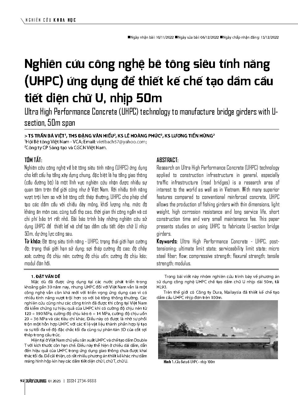 Nghiên cứu công nghệ bê tông siêu tính năng (UHPC) ứng dụng để thiết kế chế tạo dầm cầu tiết diện chữ U, nhịp 50m = Ultra High Performance Concrete (UHPC) technology to manufacture bridge girders with Usection, 50m span