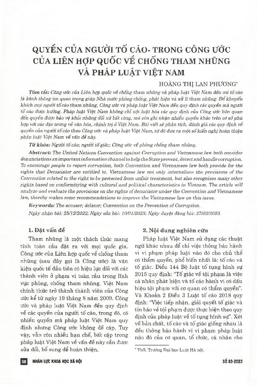 Quyền của người tố cáo - trong Công ước Liên hợp quốc về chống tham nhũng và pháp luật Việt Nam = Denuciation right – under The United Nations Convention against Corruption and Law of Vietnam