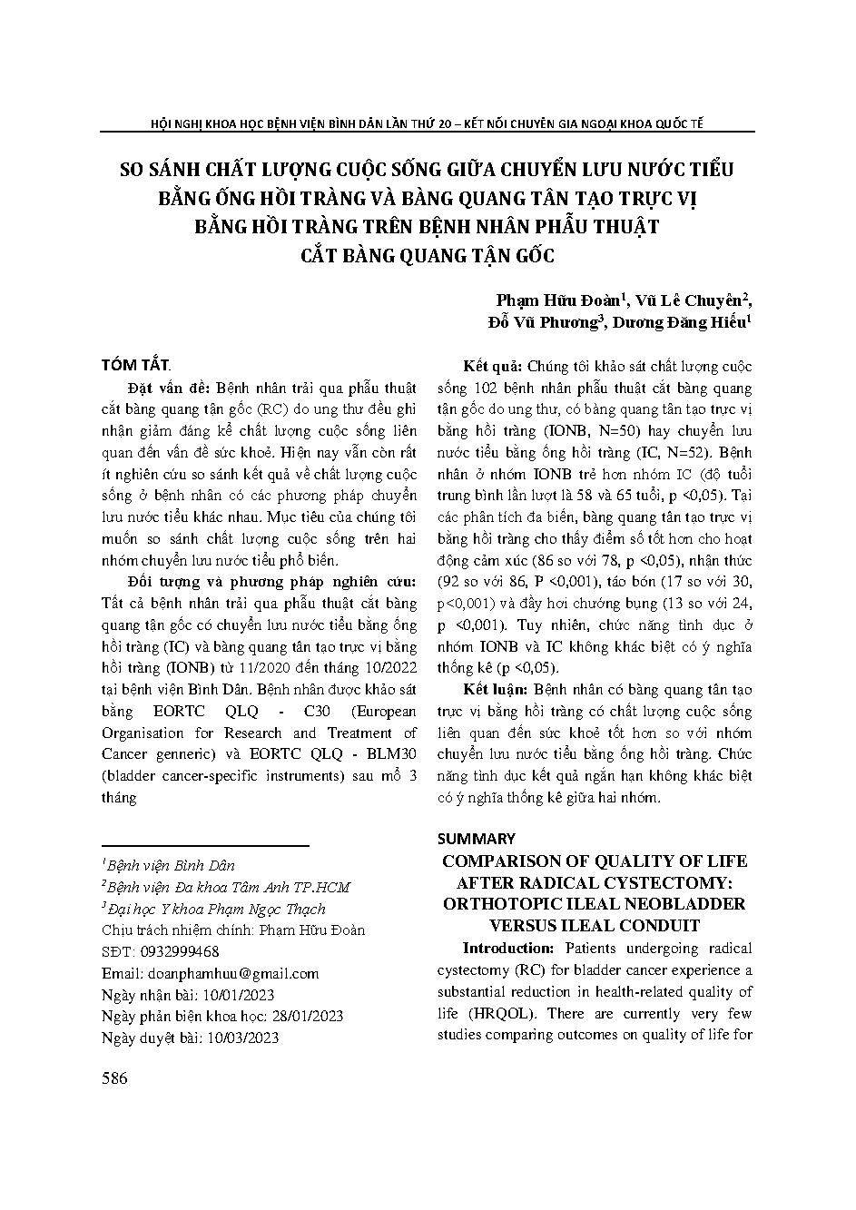 So sánh chất lượng cuộc sống giữa chuyển lưu nước tiểu bằng ống hồi tràng và bàng quang tân tạo trực vị bằng hồi tràng trên bệnh nhân phẫu thuật cắt bàng quang tận gốc