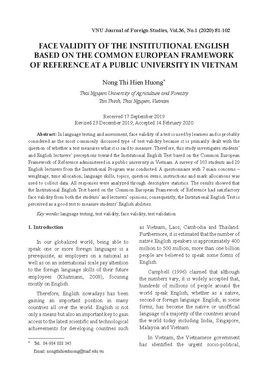 GIÁ TRỊ BỀ NGOÀI CỦA BÀI KIỂM TRA TIẾNG ANH NỘI BỘ THEO KHUNG CHƯƠNG TRÌNH CHÂU ÂU TẠI MỘT TRƯỜNG ĐẠI HỌC CÔNG LẬP Ở VIỆT NAM = FACE VALIDITY OF THE INSTITUTIONAL ENGLISH BASED ON THE COMMON EUROPEAN FRAME OF REFERENCE AT A PUBLIC UNIVERSITY IN VIETNAM