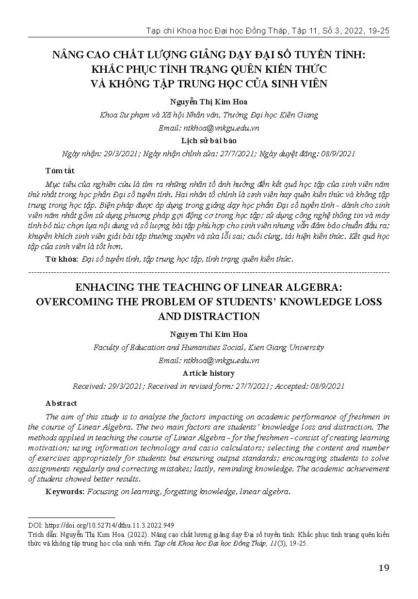 Nâng cao chất lượng giảng dạy Đại số tuyến tính: Khắc phục tình trạng quên kiến thức và không tập trung học của sinh viên = Enhacing the teaching of linear algebra: overcoming the problem of students’ knowledge loss and distraction