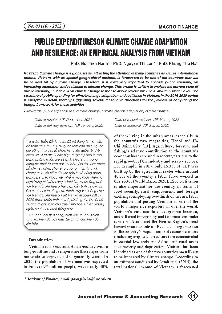 Chi tiêu công cho thích ứng và chống chịu với biến đổi khí hậu: Phân tích thực nghiệm tại Việt Nam = Public expenditureson climate change adaptation and resilience: An empirical analysis from Vietnam
