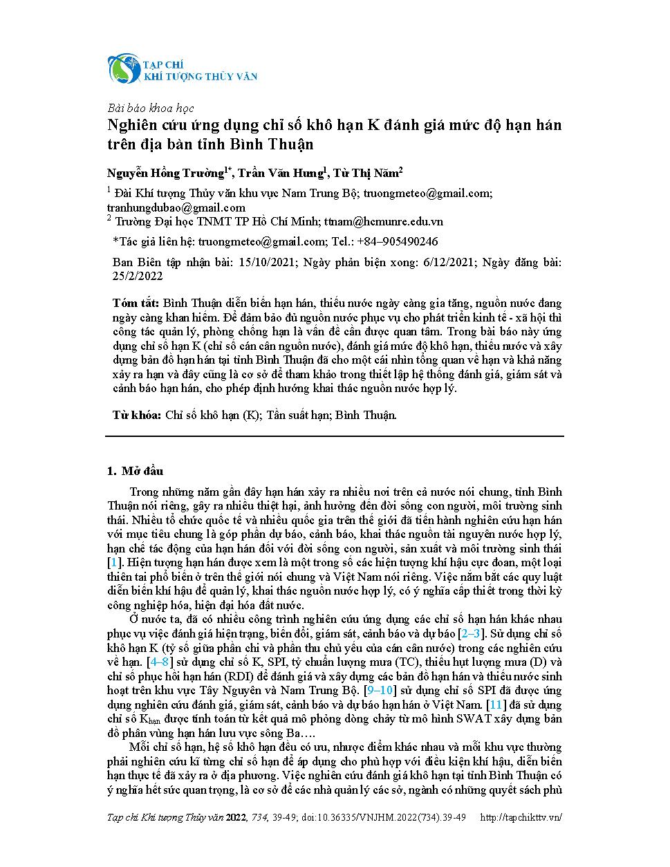 Nghiên cứu ứng dụng chỉ số khô hạn K đánh giá mức độ hạn hán trên địa bàn tỉnh Bình Thuận = Research on droughts based on the drought index (K) on Binh Thuan province