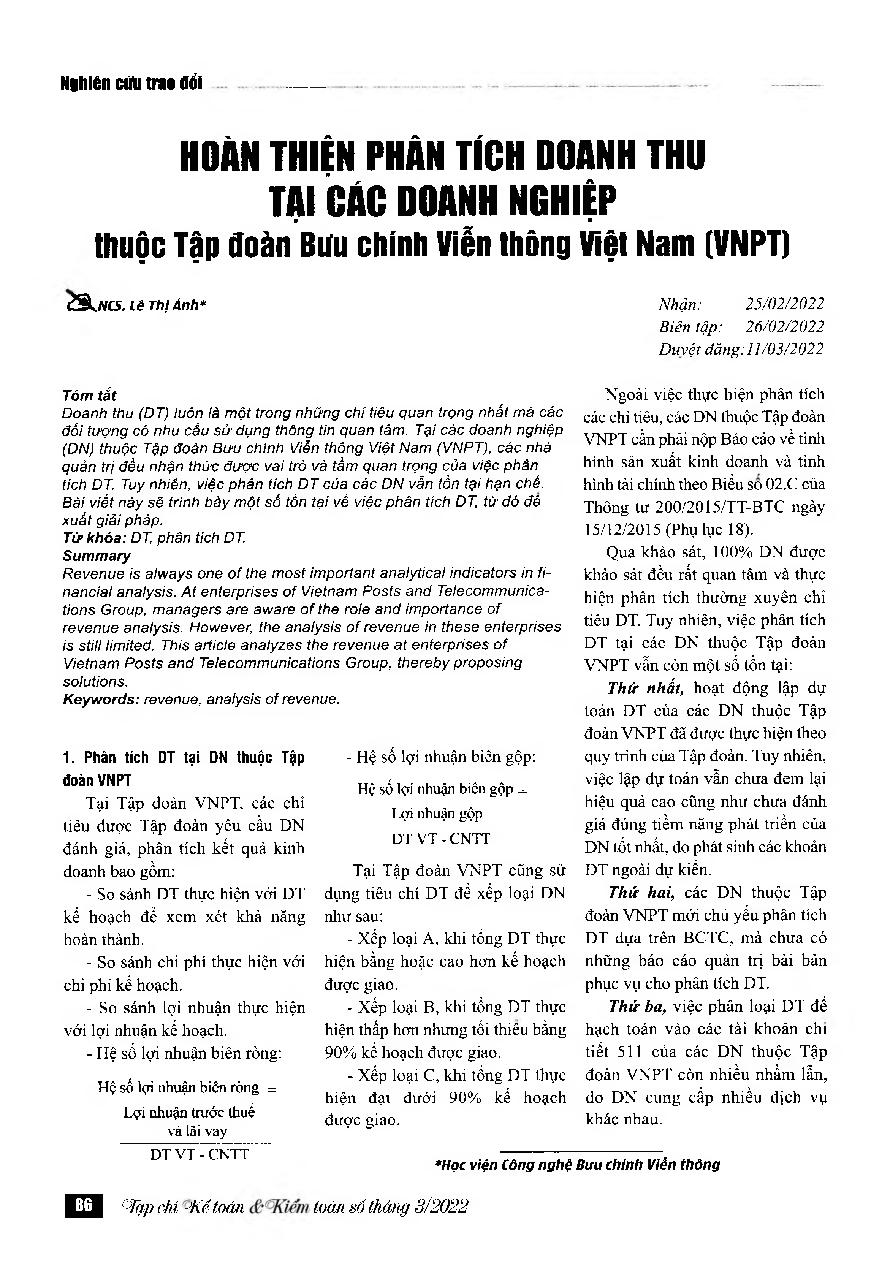 Hoàn thiện phân tích doanh thu tại các doanh nghiệp thuộc Tập đoàn Bưu chính Viễn thông Việt Nam (VNPT) = Improving the analysis of revenue in enterprises affiliated to Vietnam Posts and Telecommunications Group