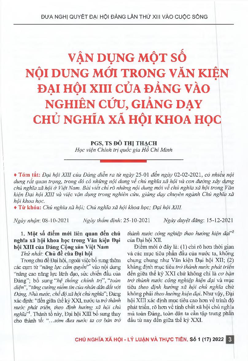 Vận dụng một số nội dung mới trong văn kiện đại hội XIII của Đảng vào nghiên cứu, giảng dạy chủ nghĩa xã hội khoa học = Applying new contents in the Document of the 13th Party Congress into researching and teaching scientific socialism