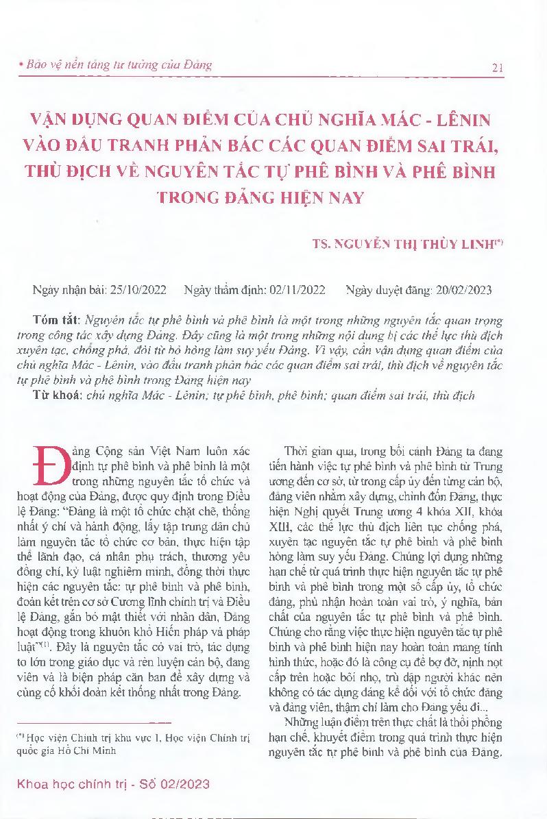 Vận dụng quan điểm của chủ nghĩa Mác - Lênin vào đấu tranh phản bác các quan điểm sai trái, thù địch về nguyên tắc tự phê bình và phê bình trong đảng hiện nay