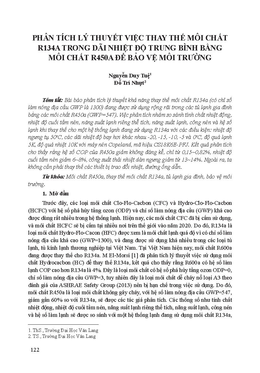 Phân tích lý thuyết việc thay thế môi chất R134a trong dải nhiệt độ trung bình bằng môi chất R450a để bảo vệ môi trường = Theoretical analysis of the refrigerant replacement of Rr134a by R450a for environmental protection