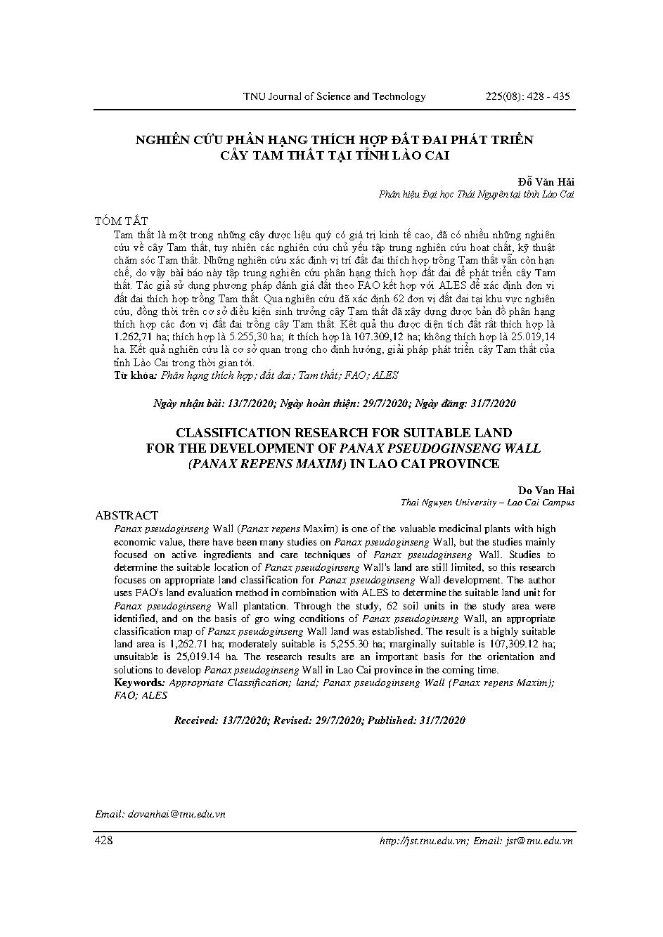CLASSIFICATION RESEARCH FOR SUITABLE LAND FOR THE DEVELOPMENT OF PANAX PSEUDOGINSENG WALL (PANAX REPENS MAXIM) IN LAO CAI PROVINCE = NGHIÊN CỨU PHÂN HẠNG THÍCH HỢP ĐẤT ĐAI PHÁT TRIỂN CÂY TAM THẤT TẠI TỈNH LÀO CAI