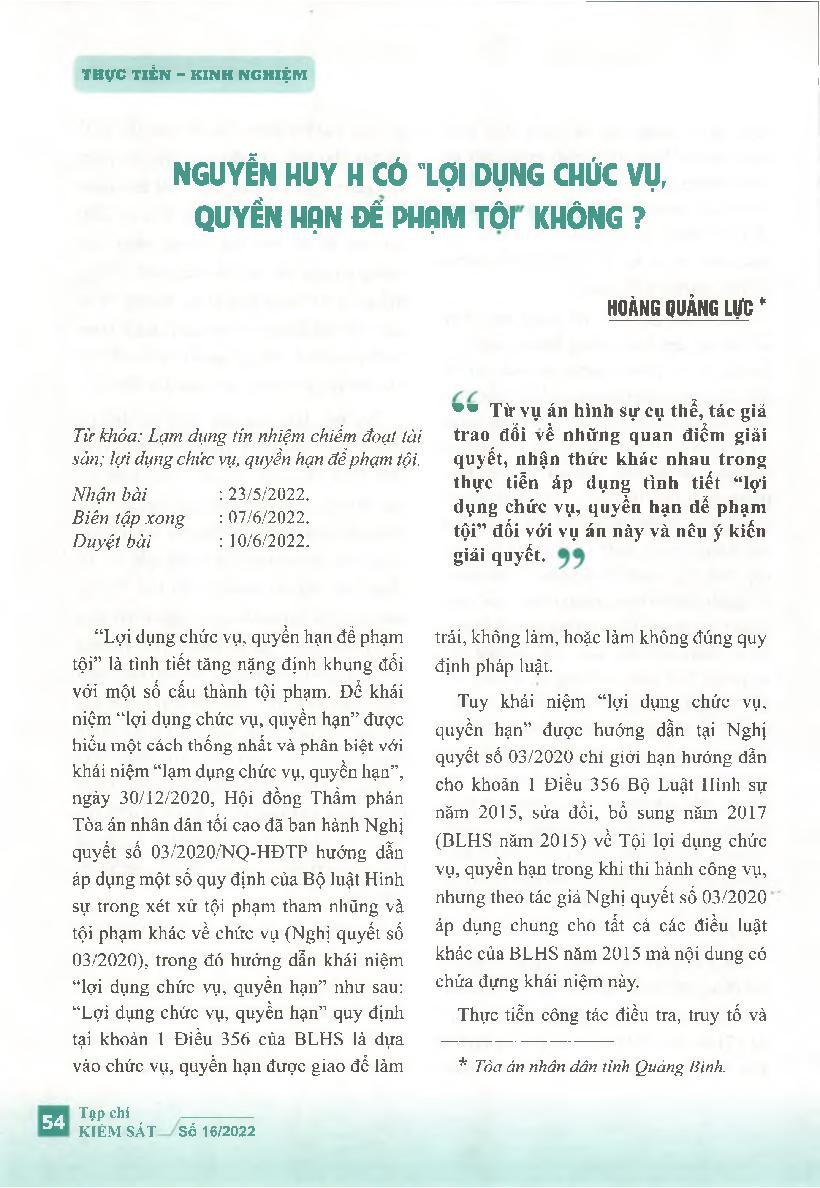 Nguyễn Huy H có “lợi dụng chức vụ, quyền hạn để phạm tội” không?
