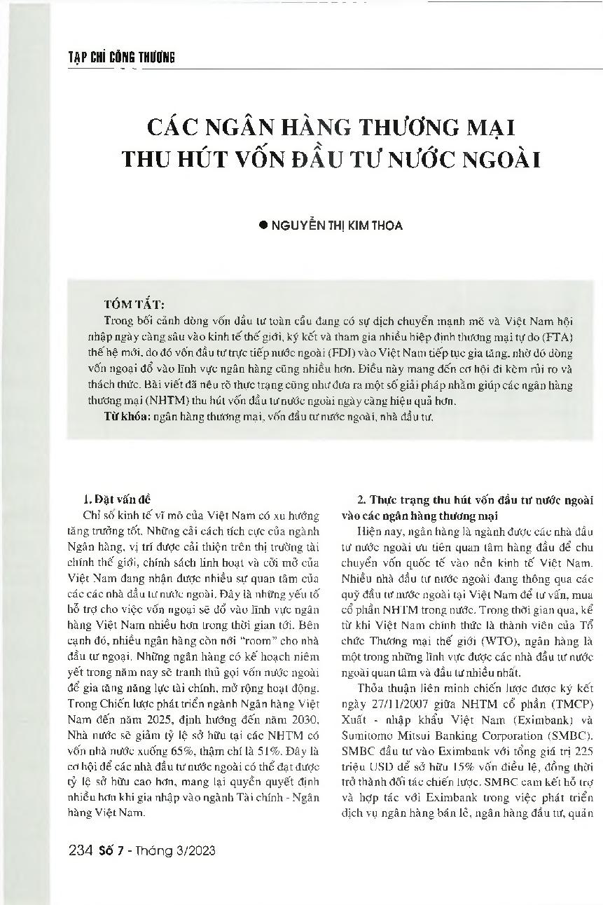 Các ngân hàng thương mại thu hút vốn đầu tư nước ngoài = Solutions to help Vietnamese commercial banks attract foreign investment more effectively