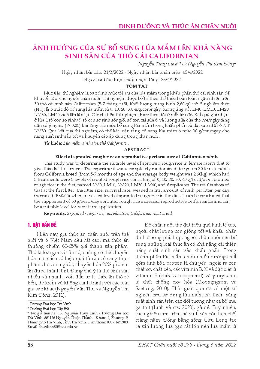 Ảnh hưởng của sự bổ sung lúa mầm lên khả năng sinh sản của Thỏ cái Californian = Effect of sprouted rough rice on reproductive performance of Californian rabits