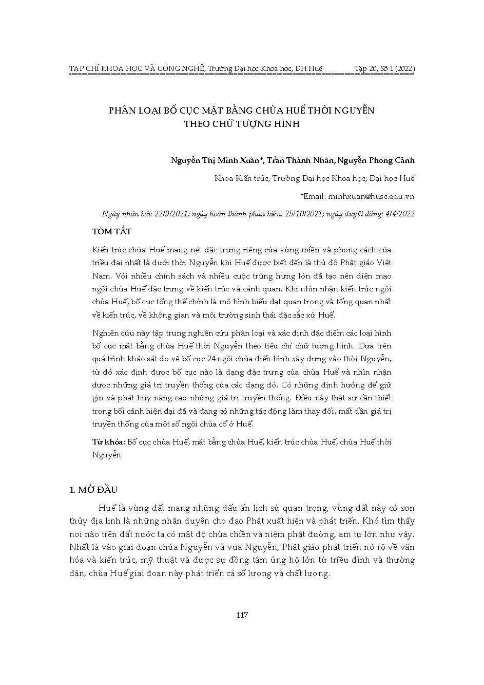 Phân loại bố cục mặt bằng chùa Huế thời Nguyễn theo chữ tượng hình = Classification of layouts of pagodas in hue under the nguyen dynasty by hieroglyph