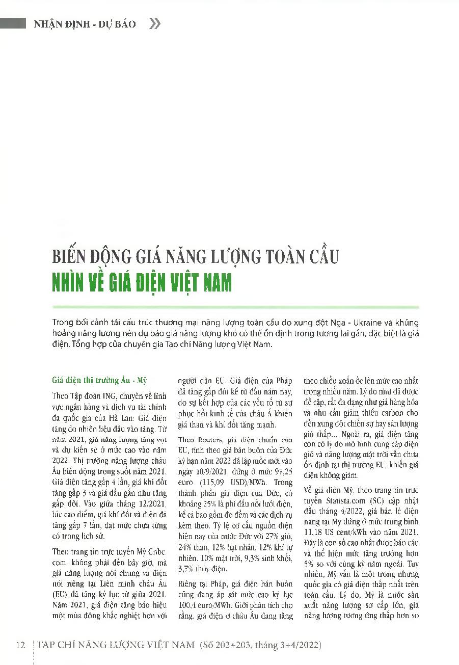 Biến động giá năng lượng toàn cầu nhìn về giá điện Việt Nam = Global energy price fluctuations look at Vietnam&; 39;s electricity prices