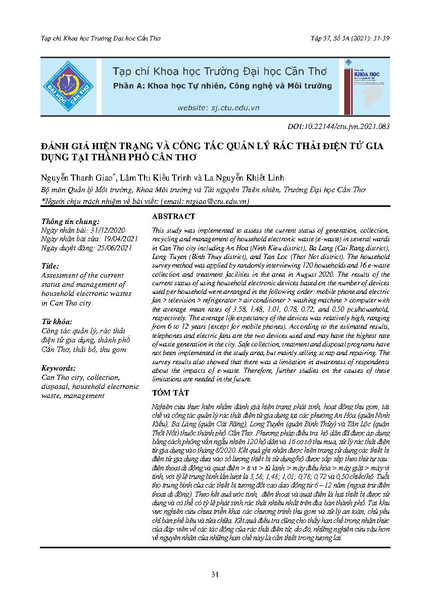 Đánh giá hiện trạng và công tác quản lý rác thải điện tử gia dụng tại thành phố Cần Thơ = Assessment of the current status and management of household electronic wastes in Can Tho city