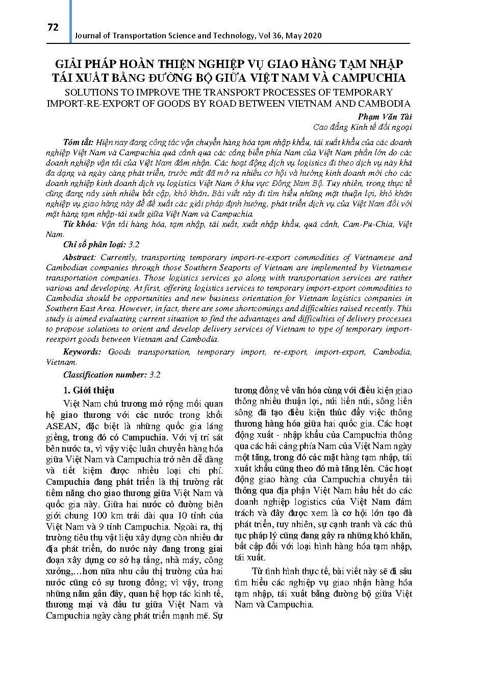 GIẢI PHÁP HÒAN THIỆN NGHIỆP VỤ GIAO HÀNG TẠM NHẬP TÁI XUẤT BẰNG ĐƯỜNG BỘ GIỮA VIỆT NAM VÀ CAMPUCHIA = SOLUTIONS TO IMPROVE THE TRANSPORT PROCESSES OF TEMPORARY IMPORT-RE-EXPORT OF GOODS BY ROAD BETWEEN VIETNAM AND CAMBODIA