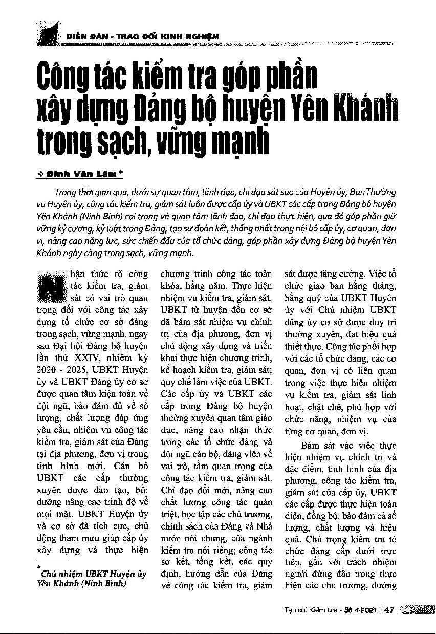 Công tác kiểm tra góp phần xây dựng Đảng bộ huyện Yên Khánh trong sạch, vững mạnh