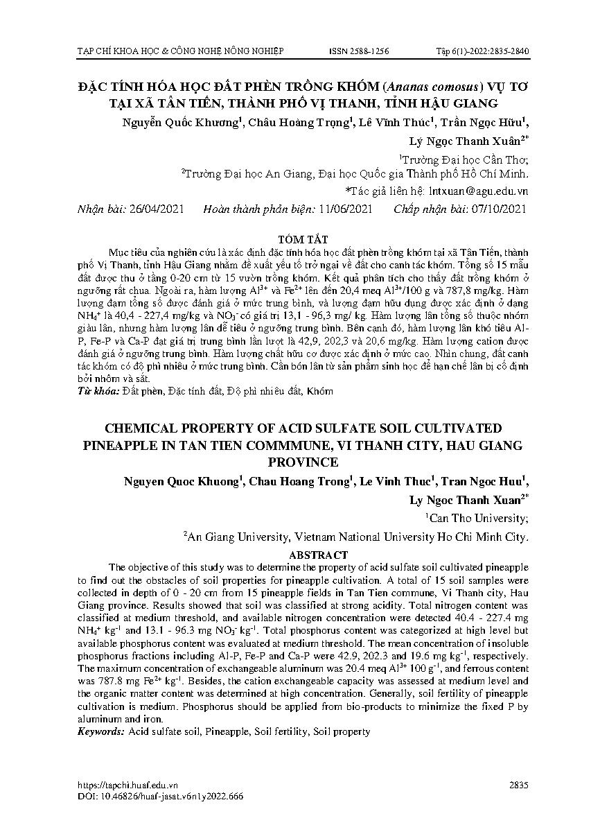Đặc tính hóa học đất phèn trồng khóm (Ananas comosus) vụ tơ tại xã Tân Tiến, thành phố Vị Thanh, tỉnh Hậu Giang = Chemical property of acid sulfate soil cultivated pineapple in tan tien commmune, vi thanh city, hau giang province